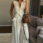 Katrine | Conjunto exala uma elegância moderna e atemporal, com um artesanato refinado numa silhueta bem equilibrada. Este conjunto de dois peças Sorrento é composto por um colete sem mangas e calças largas, que juntas criam uma forma limpa e estruturada. Disponível em Amarelo Solar e Damasco Suave, o Sorrento une cores vibrantes a um tecido respirável e sem rugas, que promete conforto e durabilidade. Com disponibilidade limitada, o conjunto é um investimento em luxo duradouro e um apelo atemporal para o colecionador exigente, onde a cintura é acentuada pelo colete e a linha longa das calças confere leveza.